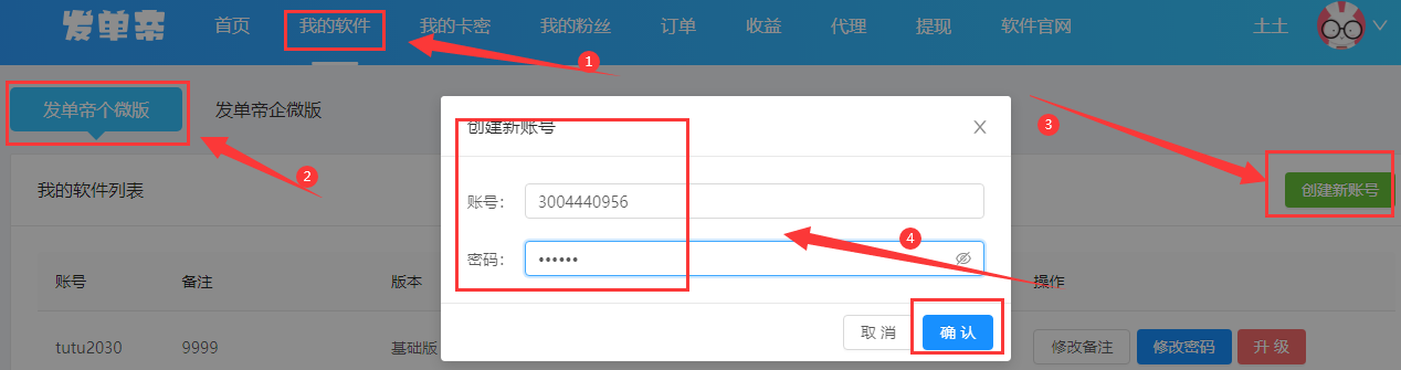1.先登录发单帝后台www.fadandi.com 在我的软件–发单帝个微版本–创建新账号–设置一下账号密码.